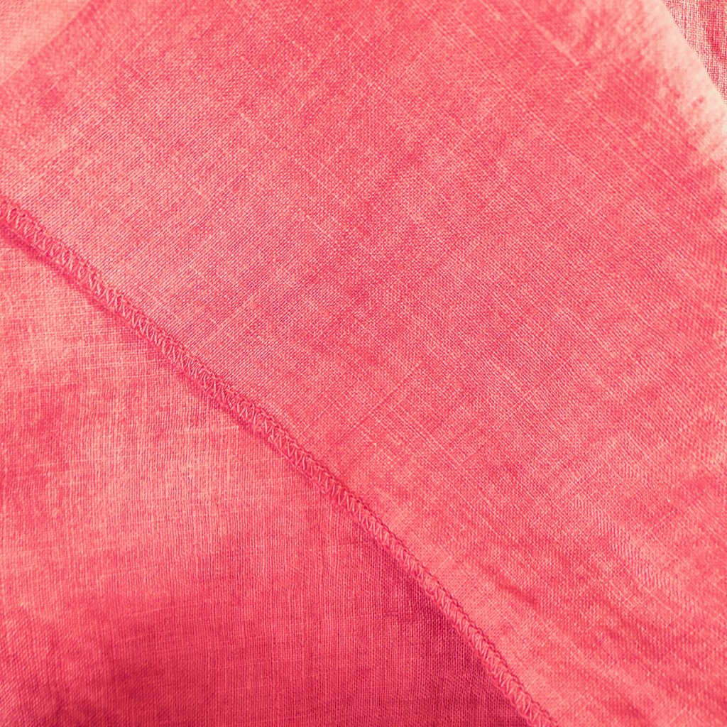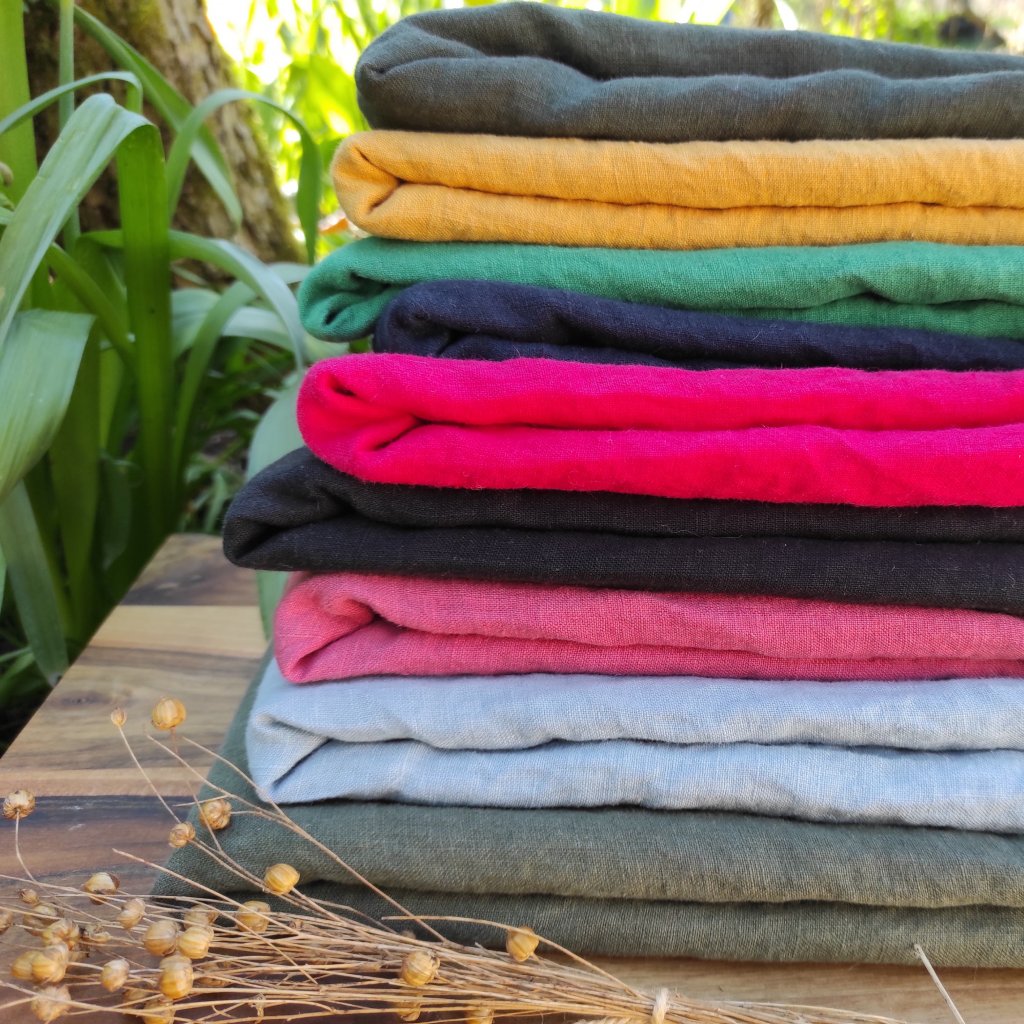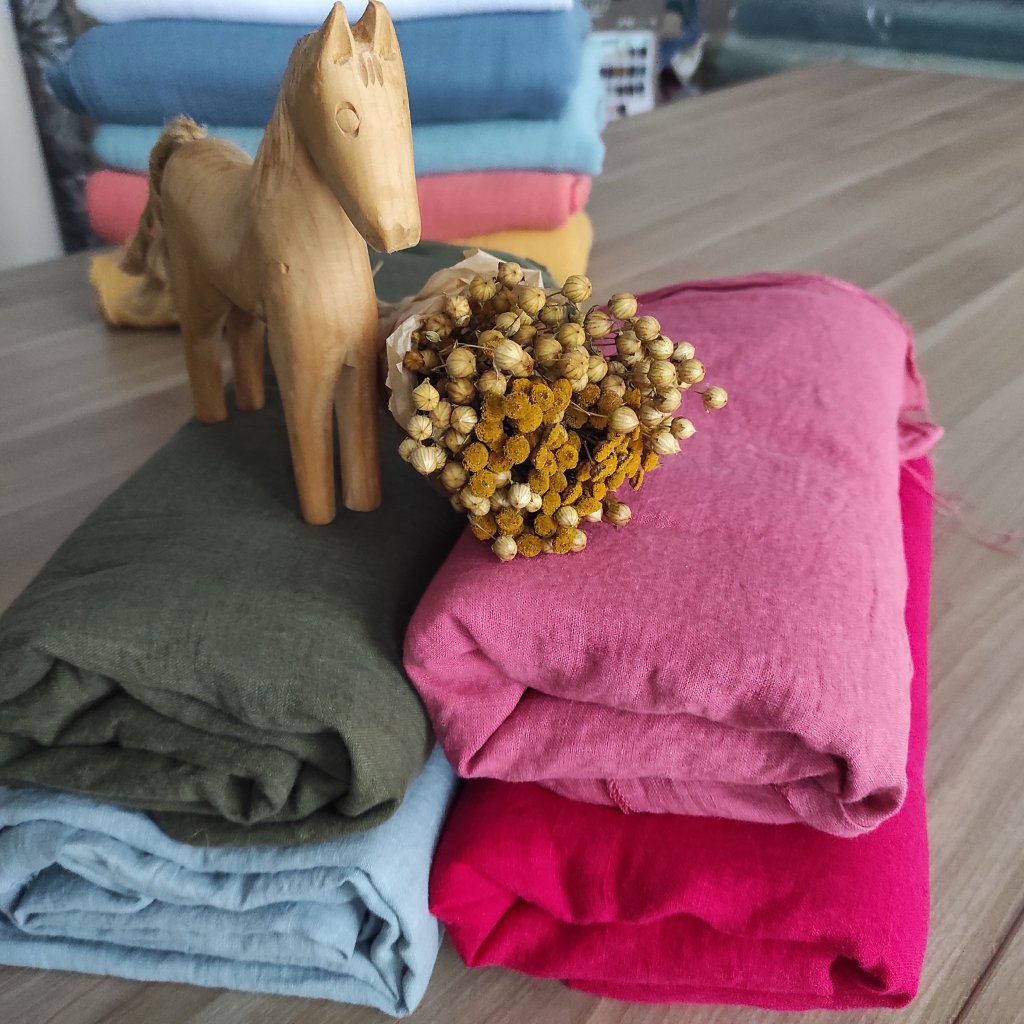 100 % ľanová látka farbená a mäkčená v českej dielni v malých rozmeroch, čím získava na vyššej mäkkosti a menšej krčivosti.